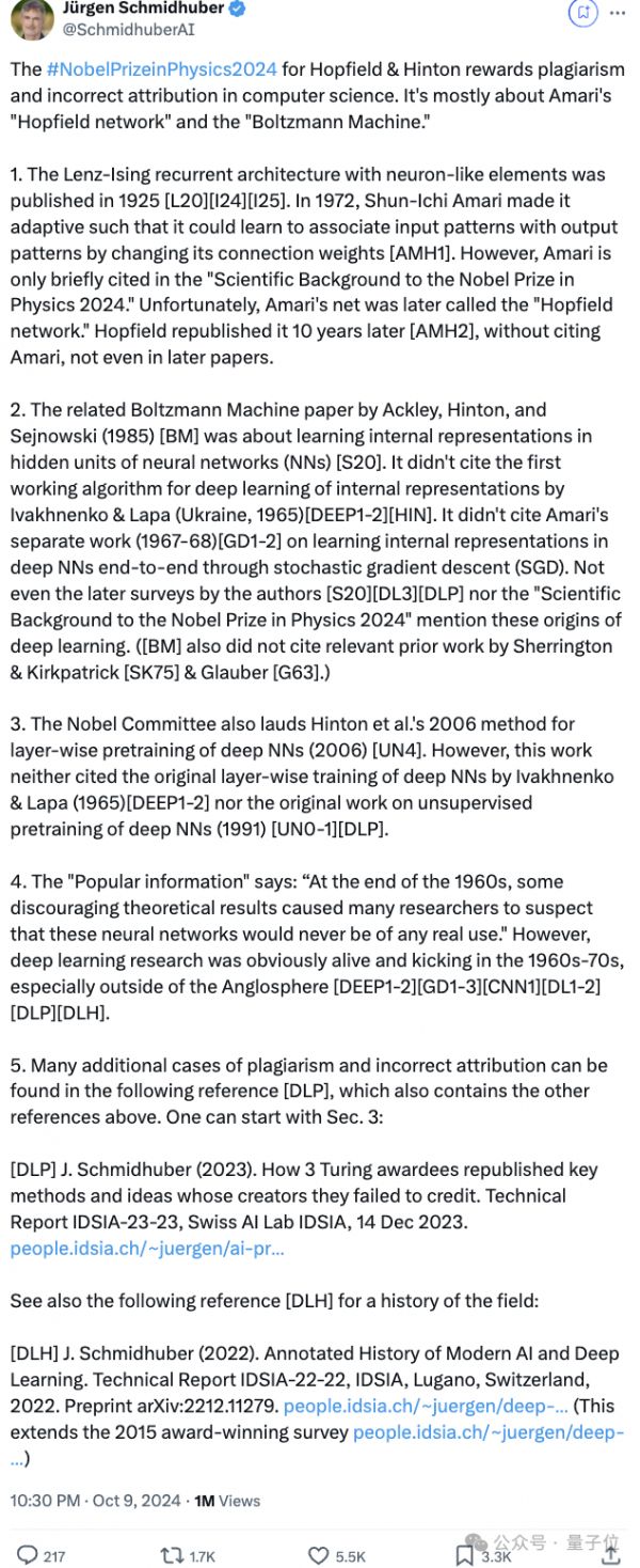 和LeCun的观点不太一样,LSTM之父Jürgen Schmidhuber在X上连发推文,观点和用词更加犀利,直接表示这“涉及计算机科学领域的抄袭和错误归属问题”。
