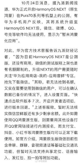 升级原生鸿蒙无法使用微信?华为技术客服回应:需要抢名额,抢不到可版本回退。