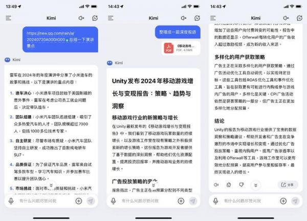 Kimi 的界面简洁直观,操作起来非常方便。响应速度也很快,通常在几秒钟内就能给出答案。此外,Kimi 还支持多种输入方式,如文本、语音、图片,极大地方便了用户。
