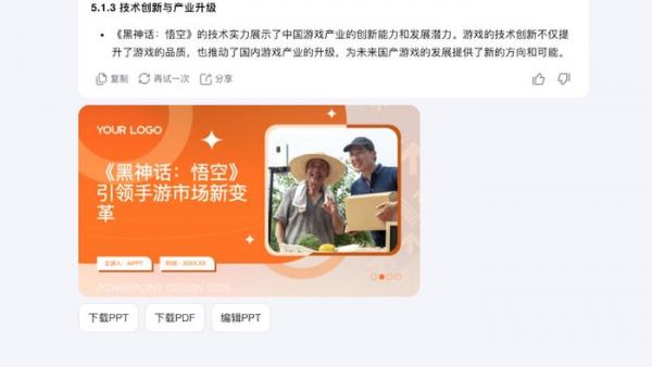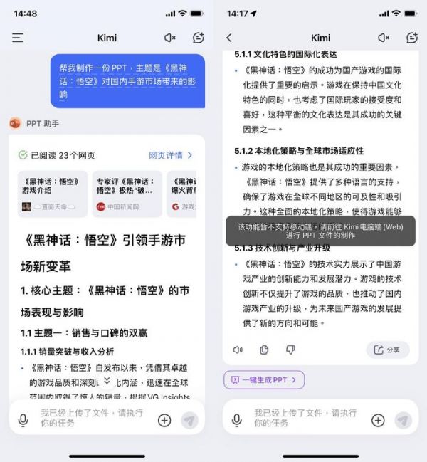 我们试着让 Kimi 生成主题为“《黑神话:悟空》对国内手游市场带来的影响”的 PPT,它很快就给出了整体框架与对应的填充内容。不过需要注意的是,App 端暂不支持生成 PPT,须转到网页端进行生成、进一步编辑等操作。最终确认完毕后可直接下载 PPT,整个过程完全免费。