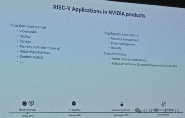 据介绍,英伟达于 2015 年开始用基于 RISC-V 的微控制器内核取代其专有微控制器。根据英伟达在 RISC-V 峰会上演示的幻灯片显示,到目前为止,其几乎所有的微控制器内核都是基于 RISC-V 架构的。