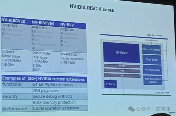 到目前为止,英伟达已经开发了至少三个 RISC-V 微控制器内核:NV-RISCV32(RV32I-MU,按顺序单发射内核)、NV-RISCV64(RV64I-MSU,乱序双发射内核)和 NV-RVV(RV32I-MU,NVRISCV32 + 1024 位矢量扩展)。这些内核(可能还有其他内核)取代了基于不同指令集架构的专有 Falcon 微控制器单元。此外,英伟达还开发了 20+ 自定义 RISC-V 扩展,以提供额外的性能、功能和安全性。