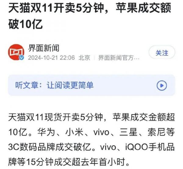 据媒体报道,10月21日当晚,苹果在天猫平台开卖仅5分钟,成交额就已突破10亿。