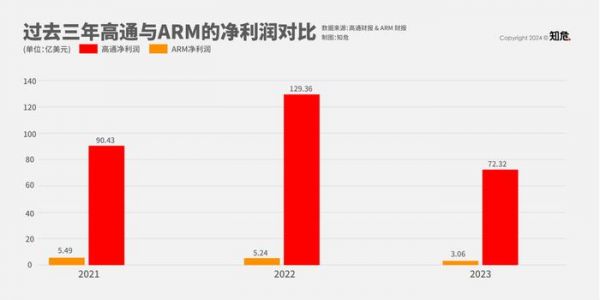 比如,过去三年,ARM 跟高通的净利润完全都不在同一个数量级: