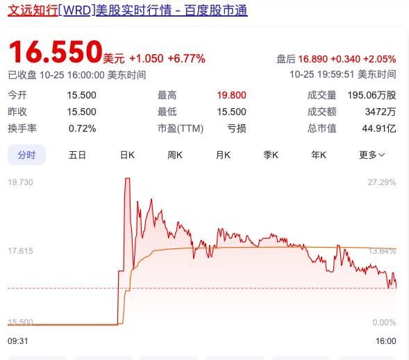 美东时间10月25日,自动驾驶企业文远知行成功登陆纳斯达克,股票代码“WRD”,发行价为15.5美元/股,开盘价与发行价一致,股价最高升至19.8美元/股,随后有所滑落,收盘价为16.55美元/股,较开盘上涨6.77%,市值为44.91亿美元(约合320亿元)。