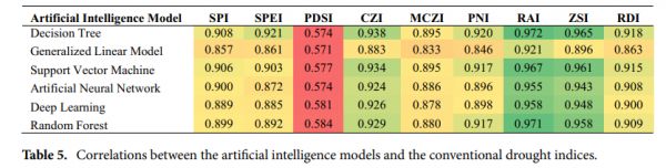 之后,他们使用 9 个常规干旱指数(如下图)与基于 AI 的 6 个干旱指数对数据进行测度,各自生成与干旱指标的相关系数并做比较。