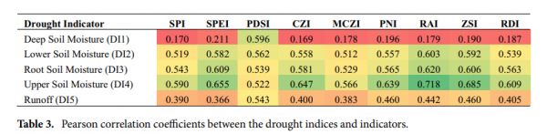 研究团队采用的评估标准基于皮尔逊相关系数、均方根误差(RMSE)和决定系数(R²)。在通过皮尔逊相关分析将传统指数的结果与干旱指标进行比较的部分,得到的相关系数表如下图所示。