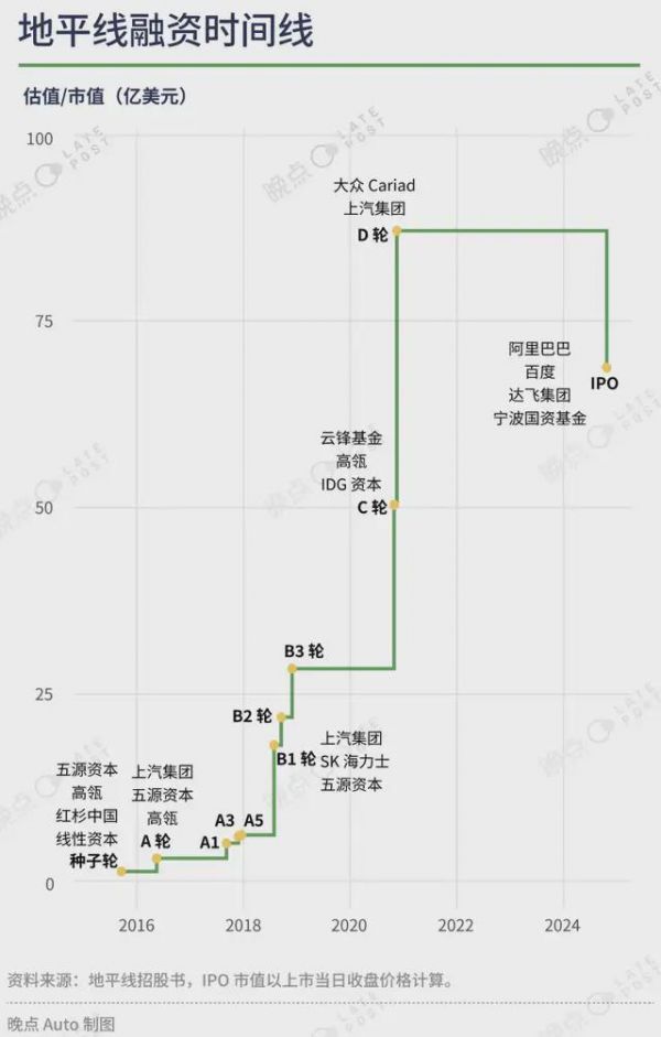 IPO 首日,地平线股价一度涨超 30%,收盘市值为 534 亿港元(约 69 亿美元),低于 D 轮融资的估值 87.1 亿美元。IPO 前,地平线累计融资 32 轮(计算各小轮次),共募资 23.63 亿美元,有大约 100 家机构参与。