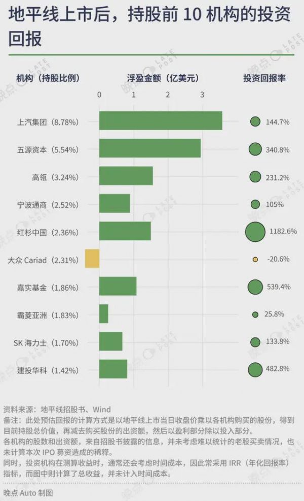 上汽从 A 轮开始投资地平线,投得最多,总计 2.5 亿美元,赚得也最多,为 3.6 亿美元,但因有 2.3 亿美元是在 B1 轮才进入,所以投资回报率只有 144.7%。