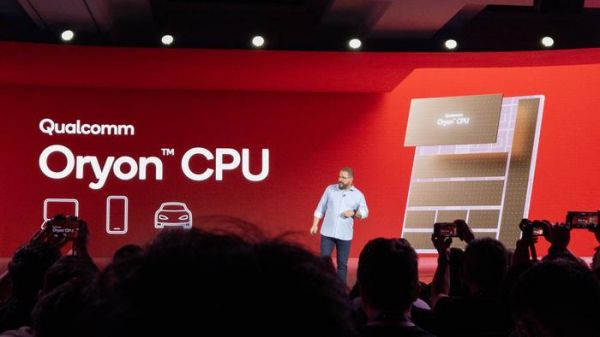 很快,在场媒体就发现了事情有些不对劲——Oryon CPU 只在骁龙 X Elite 等笔记本芯片中应用,但现场展示的幻灯片中,Oryon CPU 的标题下明明白白画着三个图标:笔记本、手机、汽车。