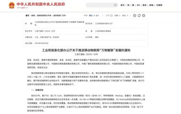 2024年8月工业和信息化部办公厅印发《关于推进移动物联网“万物智联”发展的通知》,通知表示到2027年,基于4G(含LTE-Cat1,即速率类别1的4G网络)和5G(含NB-IoT,窄带物联网;RedCap,轻量化)高低搭配、泛在智联、安全可靠的移动物联网综合生态体系进一步完善。5G NB-IoT网络实现重点场景深度覆盖。5G RedCap实现全国县级以上城市规模覆盖,并向重点乡镇、农村延伸覆盖。移动物联网终端连接数力争突破36亿,其中4G/5G物联网终端连接数占比达到95%。支持全国建设5个以上移动物联网产业集群,打造10个以上移动物联网产业示范基地。培育一批亿级连接的应用领域,打造一批千万级连接的应用领域。