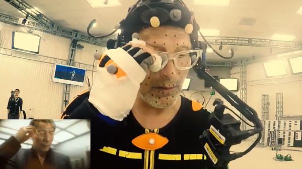 可以看到拔叔带着一整套面部动捕设备,脸上还有很多的黑点,这些黑点就是标记点,记录面部肌肉的运动,面前有摄像机阵列,大概就是通过捕捉标记点的运动和面部肌肉的变化,将这些表情信息转化成3D模型的数据,以驱动动画角色有更细腻的表演。