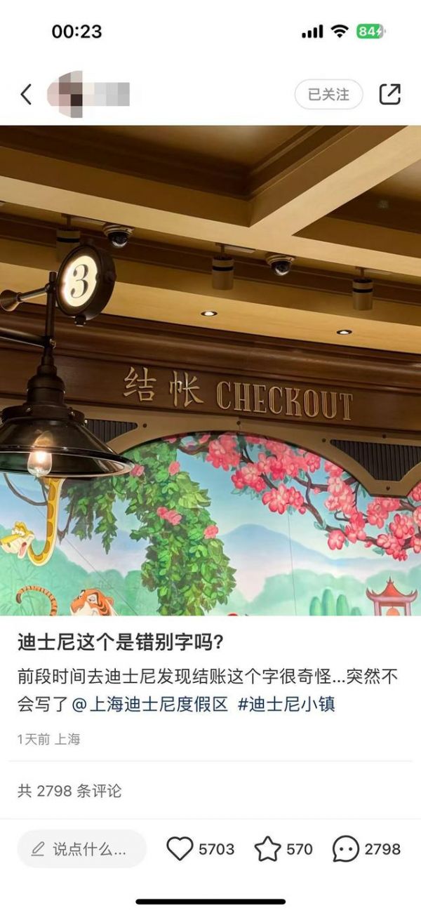 近日,有网友在社交平台上发帖称:“前段时间去迪士尼发现‘结账’这个字很奇怪……突然不会写了。”