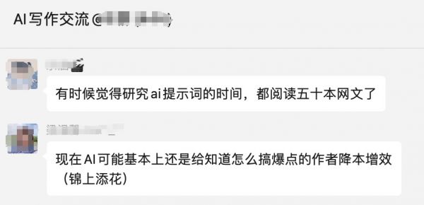 上图是在某AI写作交流群内,两位创作者的讨论,从中可见一斑。