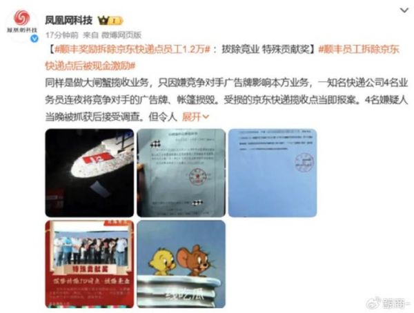 更令人震惊的是,顺丰当地公司就制作了一个“战报”,这份“前线战报”内文称:“京东在协新村大闸蟹交易市场揽收点位,大肆铺设宣传类物料(海报、门头、KT板),片区管理人员与业务员进行强势拆除,拔除竞业。现金激励12000元。”落款处为速运苏州区业务中心。