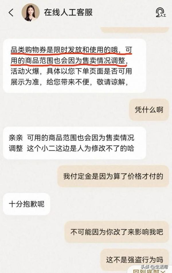 用户提供的截图显示,在发现消费券被取消使用、导致订单尾款涨价后,消费者曾联系天猫客服。对方回应称,“品类购物券是限时发放和使用的,可用的商品范围也会因为售卖情况调整。”