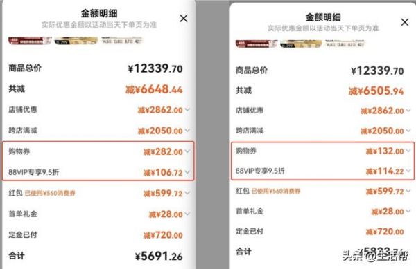 记者注意到,社交平台上不少用户反映支付定金后,尾款价格突然上涨。有用户称,10月18日通过购物车“价格抢先看”看到系统计算出来的商品总价是5691.26元,到了10月19日,总价就变成了5833.76元。经过对比,商品总价未变,但“购物券”的优惠却减少了150元,88VIP专享9.5折的优惠也减少了7.5元。