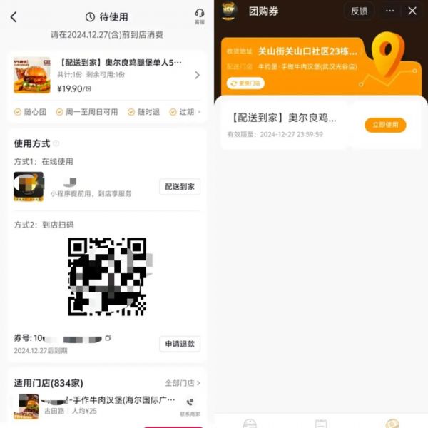 以开通随心团的汉堡商品为例,用户购买团购套餐后,可以到店进行核销取餐,也可以选择直接配送,60天内均可随时预约配送。但与以往可直接在订单页填写地址、并预约配送时间的团购配送方式不同,随心团商品的配送服务,需要在订单页中,点击跳转至商家小程序内完成最终的配送下单。