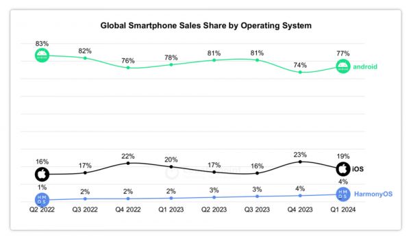 据调研机构Counterpoint数据,2024年第一季度,在全球手机市场中,安卓市场份额77%,iOS份额19%,鸿蒙仅为4%。