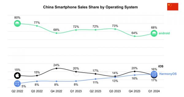不过,在中国市场,鸿蒙系统的份额已超过iOS。2024年第一季度,安卓市场份额68%;HarmonyOS超过苹果iOS,以17%的份额位列第二;iOS份额则环比下降4个百分点至16%。