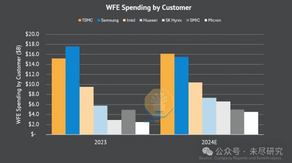 中国的先进芯片产能也将实现迅速爬坡。到2024年,如果包括华为供应链企业,以及与之关系密切的中芯国际与长鑫存储,中国本土厂商的晶圆设备(WFE)投入,已经仅次于台积电,成为全球第二大买家,远远领先于任何一家美国企业。
