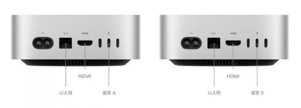 两款机型在接口方面的区别在于,M4版机身背面为3个雷雳4接口;而M4 Pro版背面为3个雷雳5接口,数据传输速度最高达到120Gb/s。