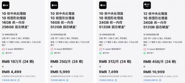 售价方面,M4版起步价为4499元、M4 Pro版起步价为10999元,叠加教育优惠均可减700元。