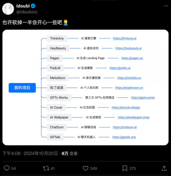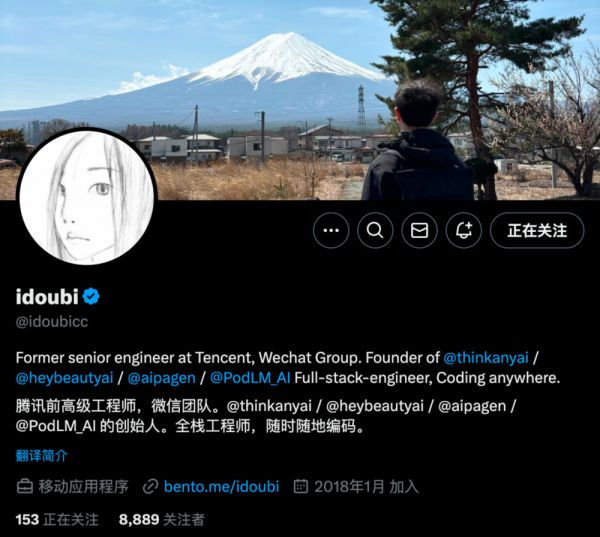 idoubi:我应该是辞职之后才发得比较多一点。去年这个时候,即刻跟 Twitter 可能也就 100 多个粉丝,处于基本上没怎么发的状态。也是因为离开公司了,没有太多压力,想表达什么就表达什么。以前要发的话还会在乎,害怕领导看到我又做新东西了,本职工作还有好多活,就开始搞自己的。就觉得不太好,不敢太多表达。