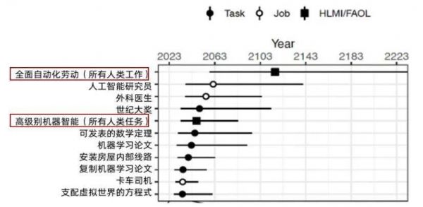 注:圆圈/方块代表总体分布中里程碑实现概率为50%的年份,区间表示概率在25%至75%之间的年份范围。请注意,这些区间代表参与者表达的不确定性的总合。图片来源:AI Impacts. (2023). Thousands of AI authors on the future of AI. AI Impacts.【1】