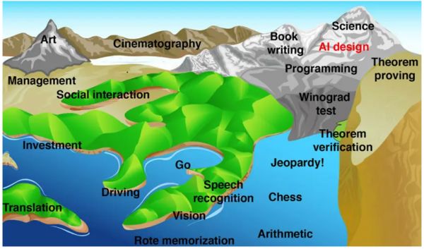下面这张图展示了AI的“海平面”正在不断上升,人往人类擅长的越来越多的领域正被AI的“汪洋”所淹没,比如翻译、驾驶和下棋等等。科学和艺术领域虽在高处,但AI也在逐步涉足,为科学发现和艺术创造提供助力。不可否认,未来会有越来越多的工作和任务受到AI的影响和冲击。
