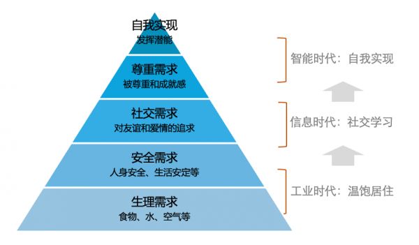 谈到人类本身,我们可以回到马斯洛的需求层次理论,从底层向上,依次是生理需求、安全需求、社交需求、尊重需求和自我实现需求。做一个不那么恰当的推理,如果说工业化时代重点解决了人类的温饱,让每个人都有体面的住处和满足基本需求的生活方式,信息时代重点满足了社会联系和学习资源的需求,那么我们是否可以期待,智能时代能够帮助我们更好地自我实现呢?这无疑是一个值得深入思考的方向。