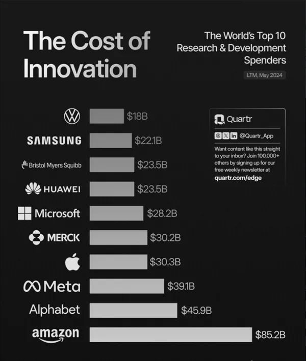 今年5月份,全球研发方面投入前十的企业里,依次是亚马逊、Alphabet、Meta、苹果、默克、微软、华为、百时美施贵宝……三星排名第九,投入为221亿美元,与第一的亚马逊852亿美元差了三倍多,与华为也有一段差距。
