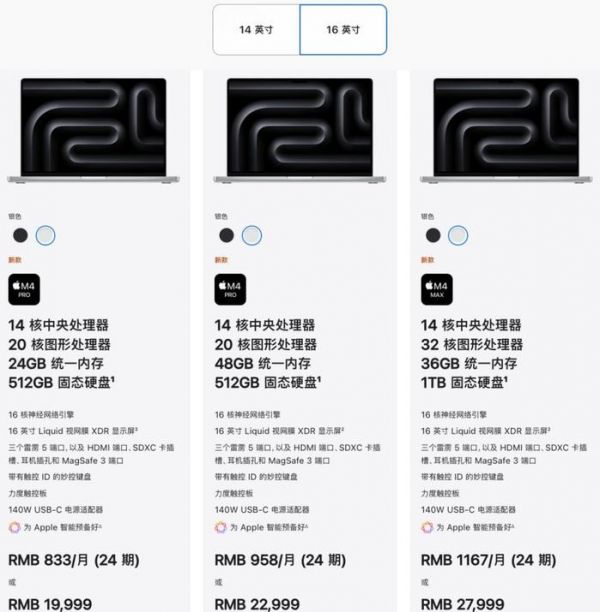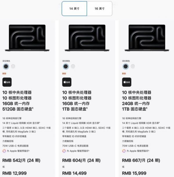 搭载 M4 芯片的 14 英寸 MacBook Pro 起售价为 12,999 元,教育优惠起售价为 12,249 元;搭载 M4 Pro 芯片的 14 英寸 MacBook Pro 起售价为 16,999 元,教育优惠起售价为 15,869 元;搭载 M4 Max 芯片的 16 英寸 MacBook Pro 起售价为 19,999 元,教育优惠起售价为 18,499 元