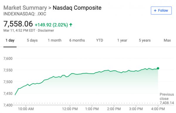 美股收盘纳指首破万点大关 特斯拉股价突破1千美元