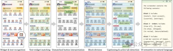 随后,系统根据 UI 布局的视觉信息进行区块划分,将界面分割成多个具有不同功能的区块,并对每个区块生成自然语言描述。