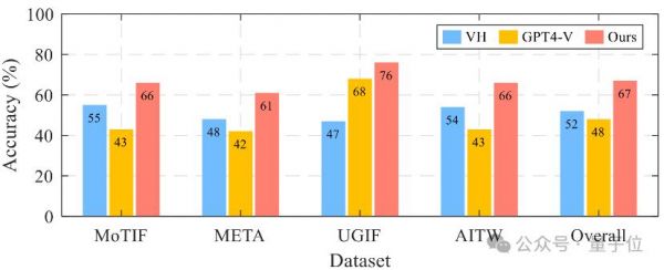 结果显示,VisionTasker在所有数据集上的平均准确率达到了67%,比基线方法提高了15%以上。