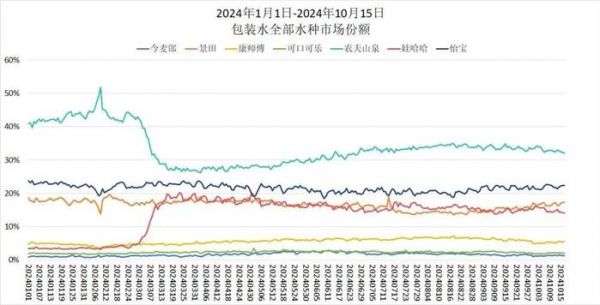 此消彼长,农夫山泉日益艰难,据“虎嗅”,某第三方机构提供的市场调研数据显示,一季度的巅峰时段,农夫山泉一度占据50%以上的市场份额,但是到了3月中旬,这一份额(红瓶天然水为主)一度下降至25%-27%区间。