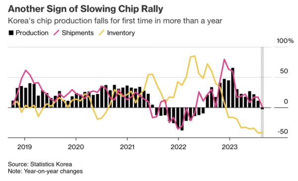 根据彭博社引述韩国政府统计局周四发布的数据显示,9月份,全国半导体产量下滑3%,与上月增长11%相比出现大幅逆转。出货量增幅也从8月份的17%放缓至0.7%。这是韩国芯片产量14个月来首次下降。考虑到他们在芯片行业的特殊位置,这带来了不好的一个信号。