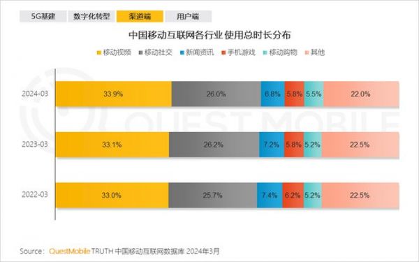 对于这一点,在数据方面有更加直观的佐证。根据QuestMobile发布的《2024中国移动互联网春季大报告》显示,近3年以来,移动视频和移动社交领域的产品用户使用时长加起来在60%左右,而移动视频类产品的使用时长占比就超过了三分之一。对照来看,移动购物类产品的总使用时长占比,仅仅只有5%左右。