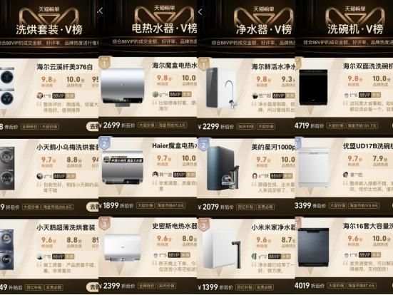具体表现如何?就拿双11主战场天猫平台来说,在天猫V榜中,海尔云溪纤美376洗烘套装、超薄10kg大容量洗衣机、16升燃气热水器、魔盒电热水器、双面洗洗碗机、鲜活水净水器、208升立式冷柜、200L空气源热泵等产品均位居品类榜榜首,畅销度高达9.8分。要知道,不同于其他榜单以单一维度或短期表现评定,天猫V榜会根据商品近90天“销售热度、好评率、商品热度”的综合指标进行排序,这不仅反映了用户的购买偏好,更是产品综合竞争力的直观体现。