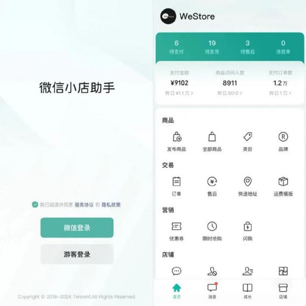 “微信小店助手”APP界面较为清爽简洁,底部分为首页、消息、成长和店铺4个导航,商家能够轻松管理商品、交易和营销活动。