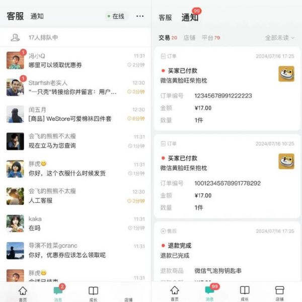 在消息界面,可以实时接收客户咨询提醒并回复,还可发送订单和推荐商品提高转化率,同时接收订单通知了解状态并处理问题。