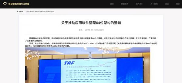 据悉,早在2023年12月移动智能终端生态联盟就发布过《关于推动应用软件适配64位架构的通知》。