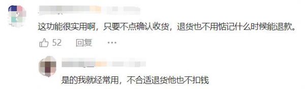 还有网友称,当购买到不合适的商品需要退货时,无需惦记着何时才能退款,这相当于免费体验了一次自己心仪的物品,有种“白嫖”的感觉,心理特别爽。