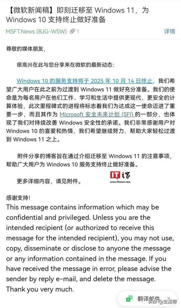 微软强调从2025年10月14日起,Windows 10将不再接收安全更新,如果用户继续使用 Windows 10系统,无法应对不断演变和调整的恶意威胁。