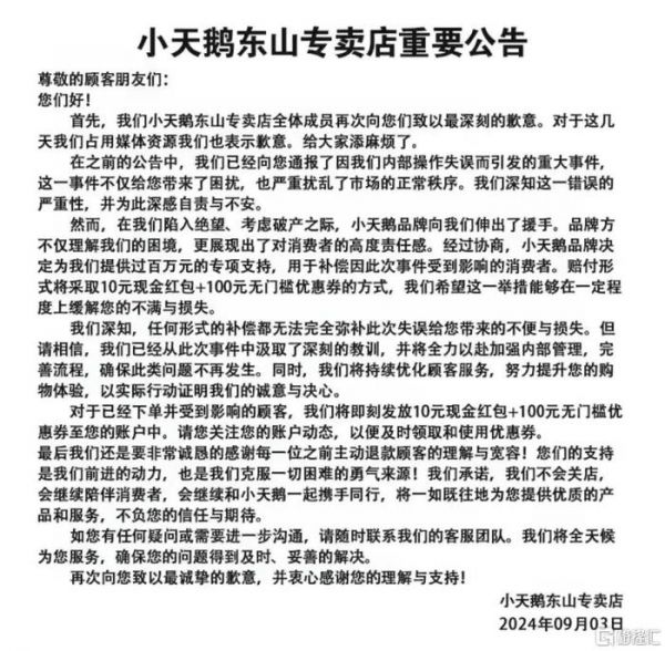 最近又有小天鹅东山专卖店,运营不小心把价格设置为成本的5折,20多分钟就被羊毛党拍下4万单,总货值超过7000万,只能发视频求网友退单。