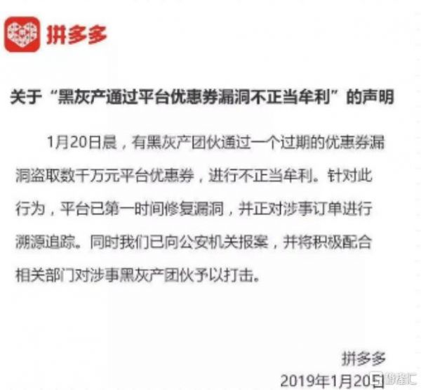 2019年,拼多多出现系统漏洞,用户可以免费领取100元无门槛购物券,羊毛党们半夜行动,直到被发现,拼多多已经被盗取数千万元优惠券。