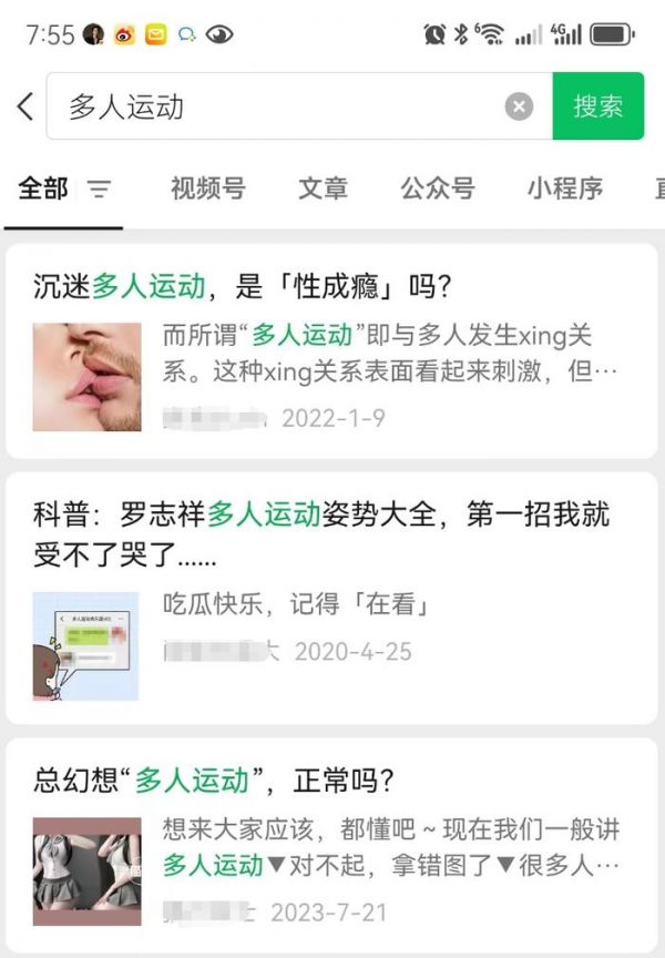 我在微信里搜索“多人运动”,结果多得吓人,尺度也大得吓人,那些文章都没事,就我万小刀违规!