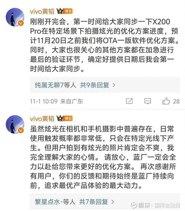 11月1日,黄韬在这条微博下的评论区给出了最新进展,X200 Pro在特定场景下拍摄炫光的优化方案进度,预计11月20日之前将OTA一版软件优化方案。同时,大家也很关心的其他方案都在加急进行最后的验证环节,确定好提供日期后会第一时间给大家同步。