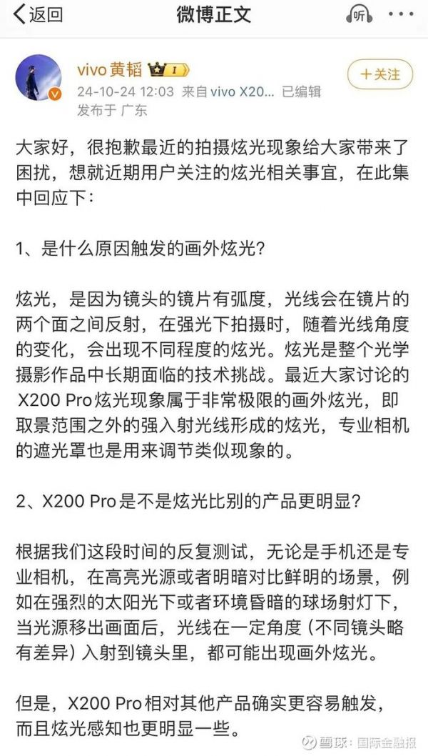 “炫光,是因为镜头的镜片有弧度,光线会在镜片的两个面之间反射,在强光下拍摄时,随着光线角度的变化会出现不同程度的炫光。炫光是整个光学摄影作品中长期面临的技术挑战。”10月24日,vivo产品副总裁黄韬在个人微博发布长文称,X200 Pro的画外炫光现象感知更明显的原因有两点,“一是和f/1.57大光圈设计有关,这个手机主摄中的最大级别的光圈,确实能带来更好的暗环境拍摄效果。但更大的光圈,更大的进光量,的确也会更容易触发画外炫光,这个是我们需要改进的地方。二是和我们的镀膜技术策略有关。”在微博中,黄韬并表示,“会尽快OTA成片优化软件功能。”